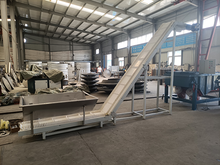 大傾角皮帶輸送機主要由波狀擋邊輸送帶、驅動裝置、傳動滾筒、改向滾筒、壓帶輪、托輥、托帶輥、立輥、拍打輪清料裝置、拉緊裝置等部分組成。大傾角皮帶輸送機其結構是在平形橡膠運輸帶兩側粘上可自由伸縮的橡膠波形立式“裙邊”,在裙邊之間又粘有一定強度和彈性的橫隔板組成匣形斗,使物料在斗中進行連續輸送。