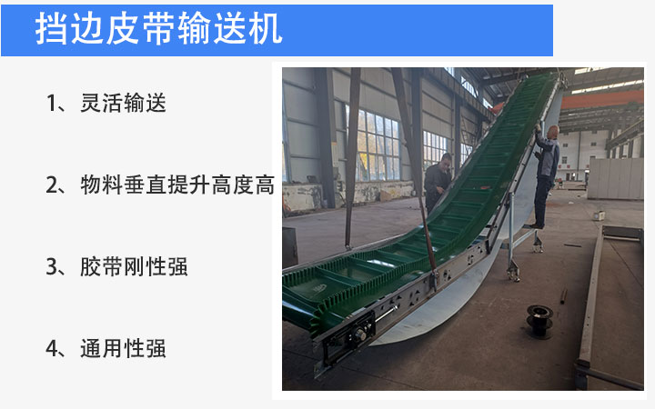 擋邊皮帶輸送機又叫波紋擋邊皮帶輸送機,是在平形橡膠運輸帶兩側粘上可自由伸縮的橡膠波形立式“裙邊”,在裙邊之間又粘有一定強度和彈性的橫隔板組成匣形斗,對物料進行連續輸送的設備。可大傾角輸送甚至垂直提升散料。